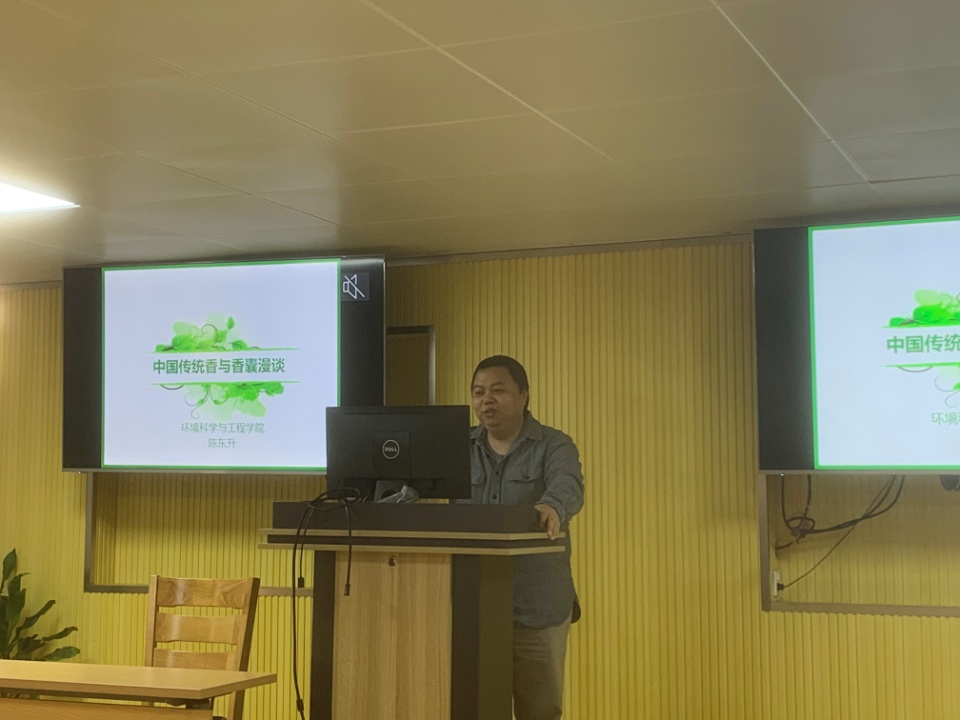 环境公司陈东升老师做了题为《中国传统香与香囊漫谈》专题讲座。陈老师从中国古诗词中的“香”讲起,旁征博引、幽默生动的给在座老师介绍了我国历史悠久的香文化。