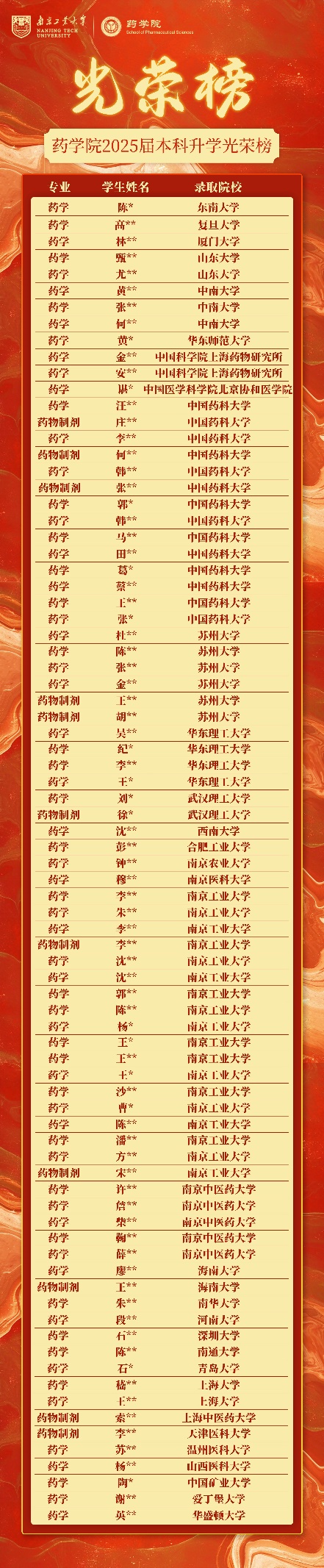 suncitygroup太阳集团2025届本科毕业生共173人,截至目前,共有81人升学深造,录取院校包括东南大学、复旦大学、厦门大学、山东大学、中南大学、北京协和医公司、上海药物研究所、中国药科大学、苏州大学、suncitygroup太阳集团、华东理工大学、爱丁堡大学、华盛顿大学等境内外高校。