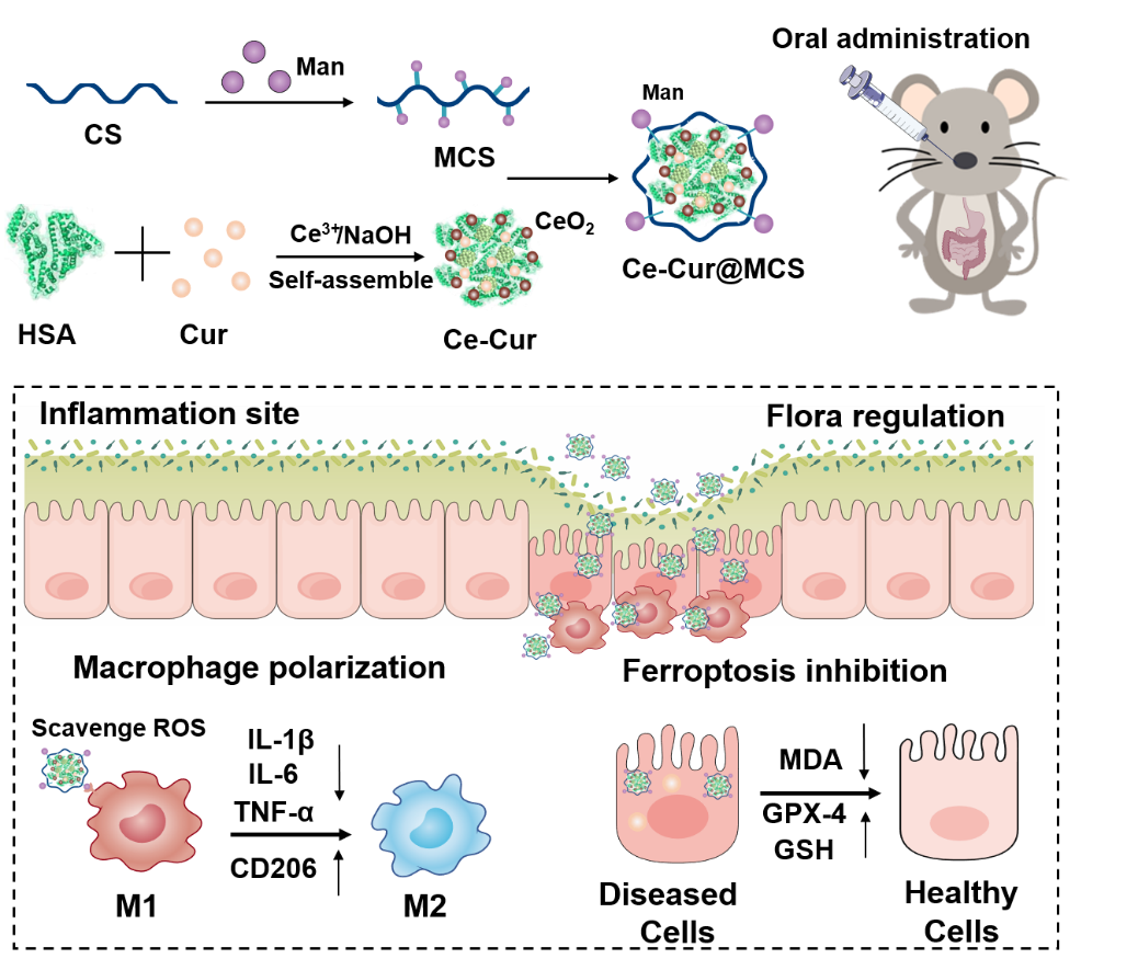 炎症性肠病是一种难治性慢性疾病,导致患者的生活质量显著下降,甚至会进展成为更严重、更致命的疾病(如结肠癌),威胁患者的生命。当前,临床使用的小分子药物、抗生素和抗体取得了一定疗效,然而,长期使用可能导致严重的并发症、抗生素耐药性和不良的免疫反应。因此,亟待开发一种靶向肠道炎症部位的治疗策略,改善肠道炎症,降低全身毒副作用。针对此问题,公司李学明教授领导的研究团队设计开发了一种口服靶向纳米抗氧化剂,通过清除自由基来调节M2巨噬细胞极化,并且抑制肠上皮细胞铁死亡及维持肠道菌群稳态来治疗炎症性肠病。本研究利用甘露糖对巨噬细胞的靶向作用,设计开发了甘露糖修饰的壳聚糖作为口服载体,利用一步自组装的方法装载姜黄素和纳米酶。本设计可以显著降低胃部环境对药物的影响,同时实现肠道和炎症巨噬细胞双级靶向。利用氧化铈纳米酶的抗氧化以及调节巨噬细胞极化,同时利用姜黄素抑制肠上皮细胞铁死亡,协同发挥治疗作用,并恢复肠道菌群稳态,达到长期治疗的目的。