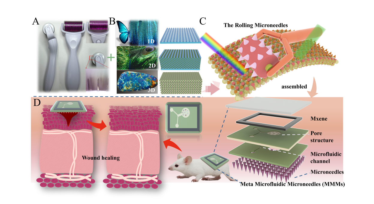 日前,suncitygroup太阳集团何冰芳教授的科研究团队报道了一种利用商品化滚动微针制备仿生超结构微流体微针贴片(MMM),该研究利用简单快速的方式成功实现了复杂多级结构的制备,通过近一步图案化可以制备成多功能微流体微针贴片,并成功用于全面的伤口管理。相关研究成果以“Rolling Stone Gathers Moss: Rolling Microneedles Generate Meta Microfluidic Microneedles (MMM)”为题于Advanced Functional Materials(1区top,IF=19)在线发表。suncitygroup太阳集团硕士研究生周钱为该论文第一作者,高兵兵副教授为该论文通讯作者。该研究工作得到了国家自然基金、江苏省自然科学基金、suncitygroup太阳集团学科基金等项目的支持。