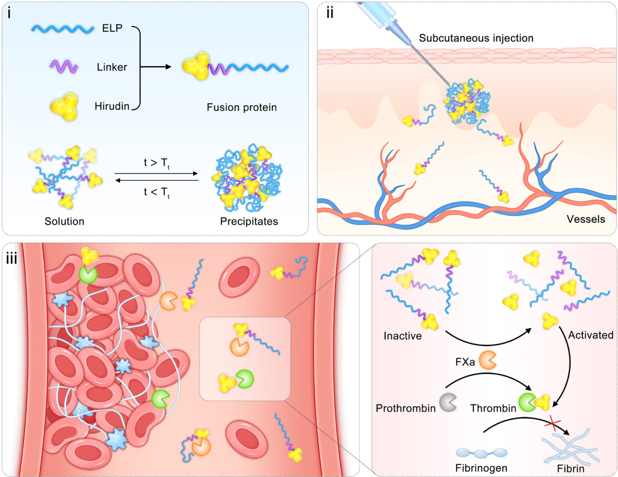 研究团队基于类弹性蛋白多肽具有低温可溶、高温凝聚的特性,利用基因工程技术整合重组水蛭素(hirudin variant, HV)、类弹性蛋白多肽(elastin-like peptide, ELP)和酶响应性模块,定制了一系列水蛭素-类弹性蛋白多肽融合蛋白,具有滞留时间可调控和精准释药的特点。融合蛋白能够在体内形成原位储库,经缓慢扩散进入血液循环。该融合蛋白在循环中无抗凝活性,当到达血栓形成部位,可响应体内凝血因子Xa浓度变化释放水蛭素,精准调控释药量。